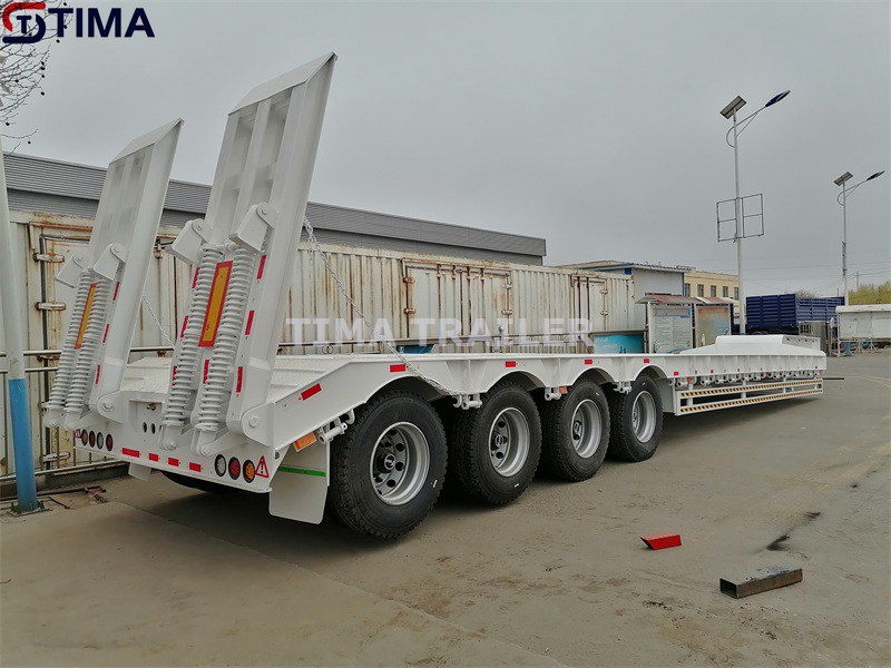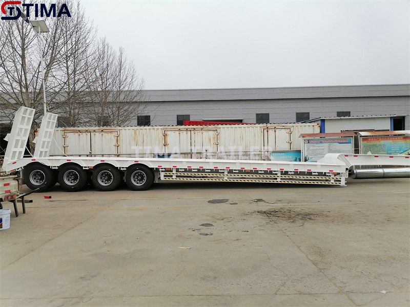Remorque surbaissée à 4 essieux de 8 0 tonnes très adaptée au transport de grosses machines, avec une largeur de 3000 mm + 250 mm x 2, une plate-forme de chargement de 1200 mm de hauteur . Centre de gravité bas pour un transport de marchandises plus sûr.