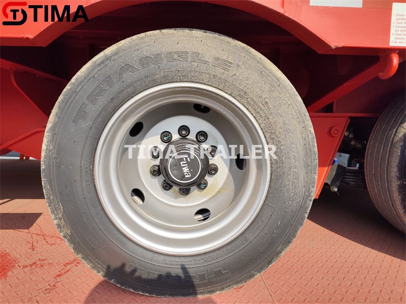 Cette semi-remorque surbaissée est équipée de pneus de marque Triangle. Nous pouvons également choisir d'autres marques de pneus, telles que CHENGSHAN, LINGLONG, CHAOYANG, DOUBLE STARE, etc. Les pneus sont divisés en pneus à fil d'acier et pneus à vide. Les modèles de pneus à fil d'acier sont 11.00R20, 12.00R20, 12.00R24 (pneus du désert) 14.00R20 Les modèles de pneus à vide sont 11.00R22.5, 295/80R22.5, 12R22.5, 315/80R22.5, 13R22. 5. Il n'y a pas de doublure à l'intérieur du pneu à vide, qui résiste au zapping et non à l'abrasion, et convient au transport longue distance. Et les pneus en fil d'acier ont une doublure à l'intérieur, résistante à l'usure mais non résistante au zap, adaptée aux travaux lourds. Nous pouvons personnaliser les pneus en fonction des besoins du client.